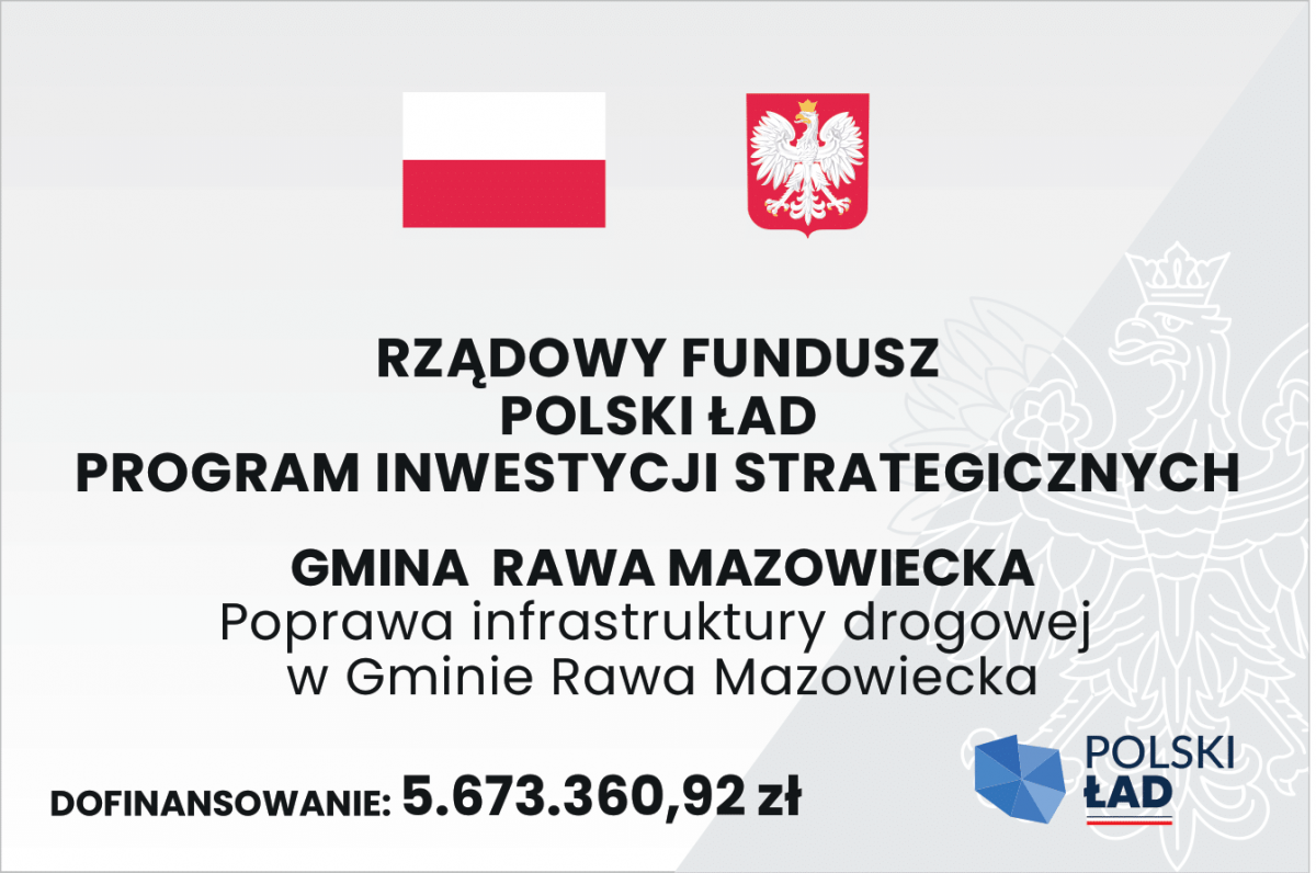 Gmina Rawa Mazowiecka realizuje inwestycję „Poprawa infrastruktury drogowej w Gminie Rawa Mazowiecka” dofinansowany z Rządowego Funduszu Polski Ład: Programu Inwestycji Strategicznych. W ramach zadania zostaną wyremontowane odcinki dróg gminnych i wewnętrznych o nawierzchni gruntowej oraz utrwalonej powierzchniowo.