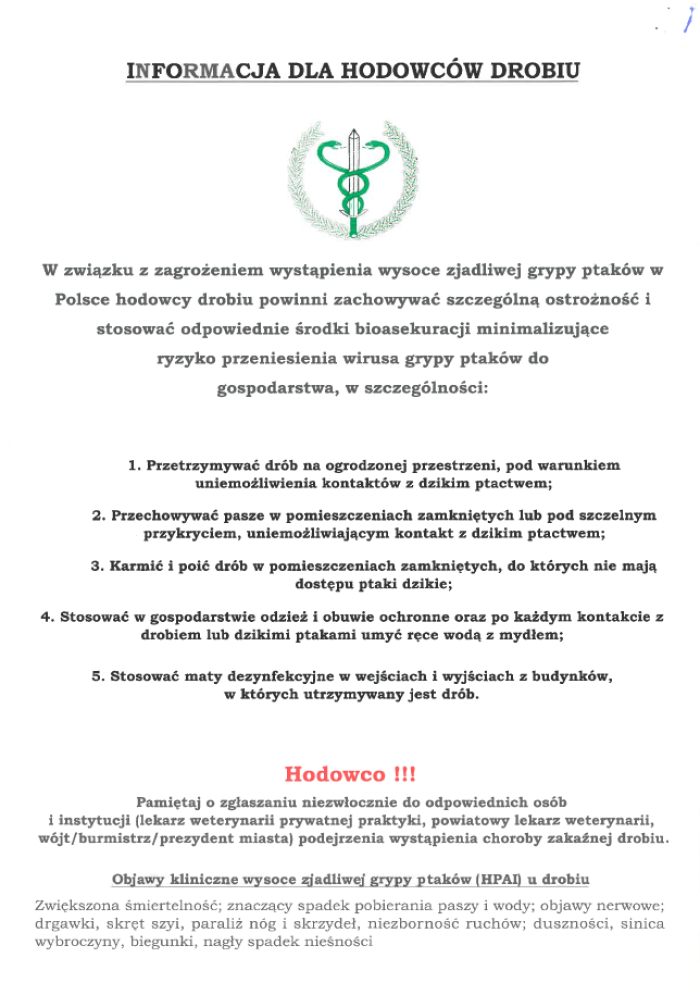 Powiatowy Lekarz Weterynarii w Rawie Mazowieckiej informuje o szybkim rozprzestrzenianiu się wysoce zjadliwej grypy ptaków w gospodarstwach utrzymujących drób na terenie kraju i apeluje o przestrzeganie zasad bioasekuracji przy wykonywaniu działań/czynności/usług w gospodarstwach, w których utrzymywany jest drób.