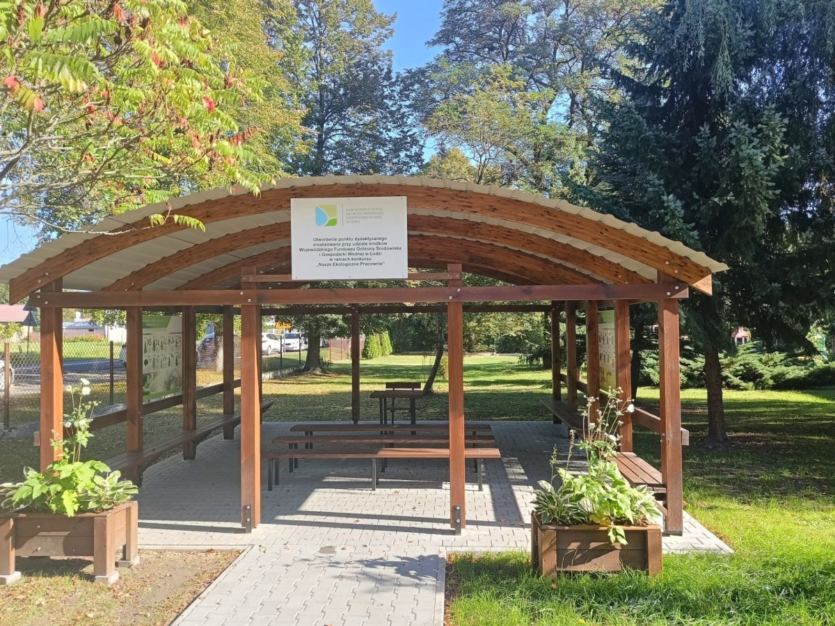 Z radością informujemy, że przy naszej szkole powstał punkt dydaktyczny „Nasze Ekologiczne Pracownie”, którego celem jest rozwijanie świadomości ekologicznej wśród uczniów oraz promowanie postaw proekologicznych w społeczności szkolnej. Pracownia została utworzona przy udziale środków Wojewódzkiego Funduszu Ochrony Środowiska i Gospodarki Wodnej w Łodzi w ramach konkursu „Nasze Ekologiczne Pracownie”. Dzięki uzyskanemu dofinansowaniu, punkt dydaktyczny został wyposażony w pomoce dydaktyczne oraz materiały umożliwiające prowadzenie ciekawych i angażujących zajęć. Przestrzeń ta sprzyja łączeniu wiedzy teoretycznej z praktyką. W pracowni „pod chmurką” znajdują się m.in. tablice edukacyjne, które przybliżają zagadnienia związane z przyrodą i ekologią. Ponadto w przestrzeni edukacyjnej umieszczono karmnik i budki lęgowe, które wspierają lokalną faunę oraz gazony na kwiaty i zioła, które uczniowie mogą poznawać i pielęgnować. W ramach edukacji ekologicznej stworzono również całoroczną rabatę, która uczy o cyklach przyrody oraz zjawiskach naturalnych. Warto dodać, że w pracowni znajduje się altana, idealna do zajęć na świeżym powietrzu oraz ścieżka sensoryczna, która rozwija zmysły i uczy rozpoznawania różnych faktur. W punkcie dydaktycznym umieszczony został również zegar słoneczny, który umożliwi uczniom praktyczne zrozumienie podstawowych zagadnień związanych z ruchem Ziemi, czasem. Aby promować odpowiedzialność ekologiczną, zainstalowano także kosze do segregacji odpadów, zachęcające do dbania o czystość i recykling. Pracownia będzie wykorzystywana nie tylko podczas lekcji przyrody, biologii, geografii, ale również innych zajęciach, np.: na muzyce, plastyce, zajęciach edukacji wczesnoszkolnej czy zajęciach z wychowawcą.